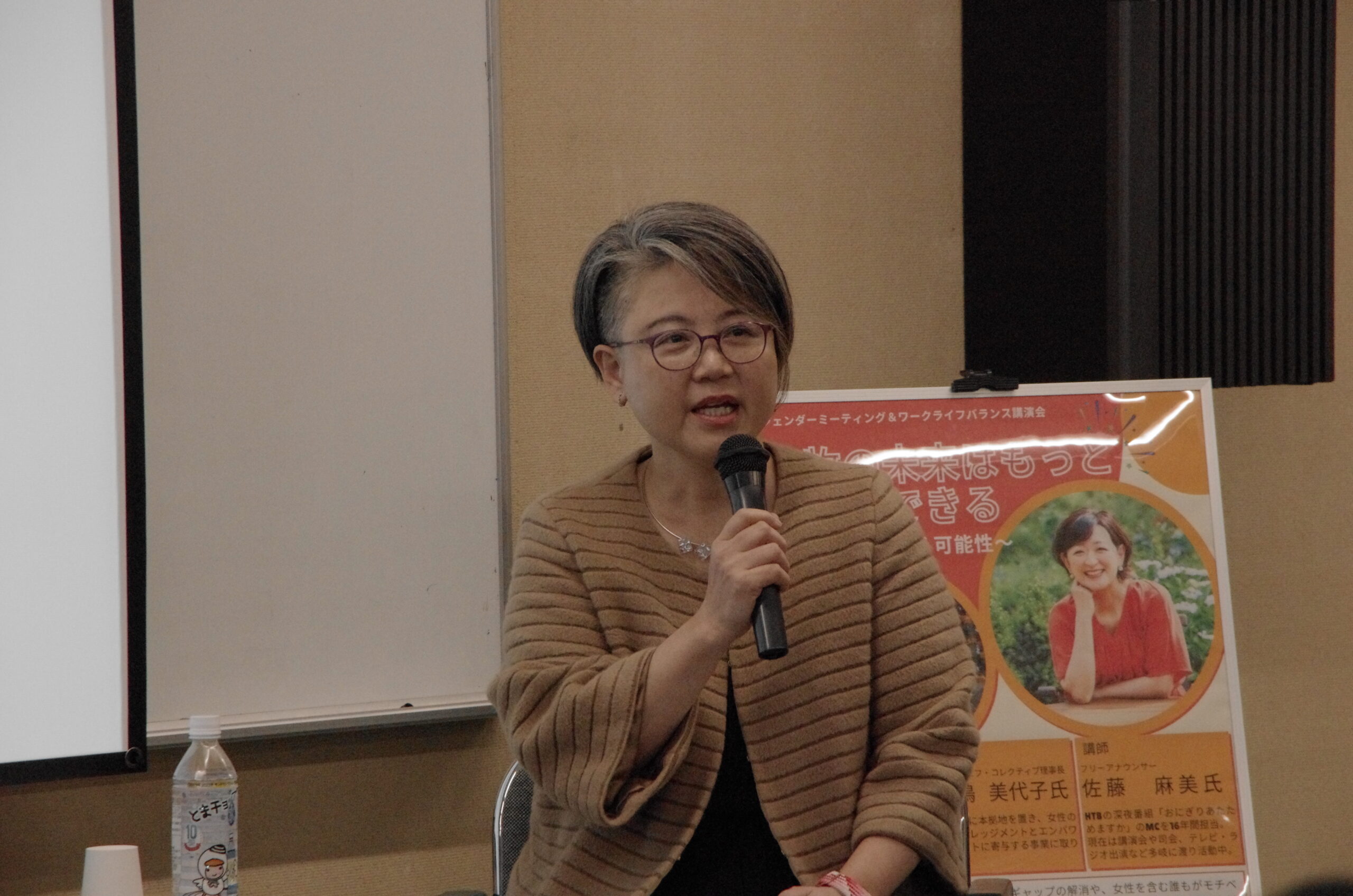 当NPO法人エフ・コレクティブ理事長・小嶋が佐藤麻美さん(元HTB北海道テレビアナウンサー)とクロストークしました。北海道と苫小牧の男女平等の数字を見ながら、会場参加者の質問にお答えしました。「女性がひとり増えたら、まちはどう変わるのか?」を切り口に、ジェンダーギャップの解消が地域の活力や働きやすさにつながる可能性について、具体的な事例を交えてお話ししました。誰もがモチベーション高く、生き生きと働ける地域づくりの重要性を改めて共有する機会となりました。