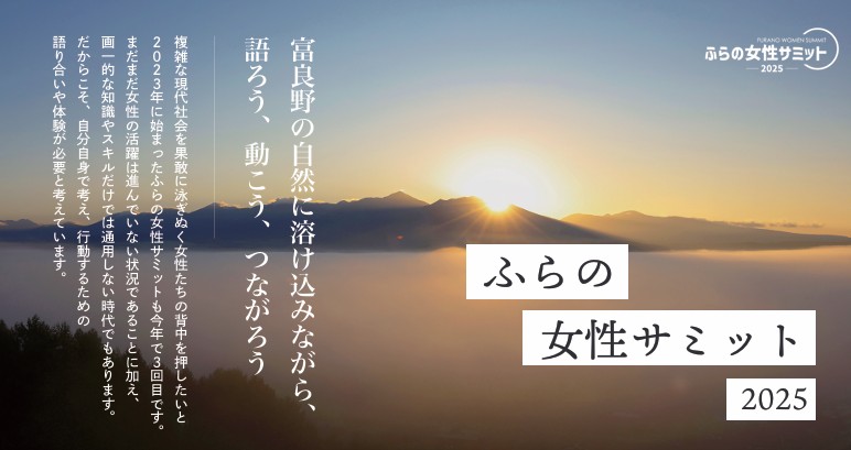| ふらの女性サミット2025 パート参加(3日目講演) ※販売中 | \5,000- | ふらの女性サミット2025のうち新井和宏氏講演のみの、参加チケットです 日時:2025年10月19日(土) 9:00-10:00 会場:ふらのラテール チケットの購入: STORESから Peatixから |